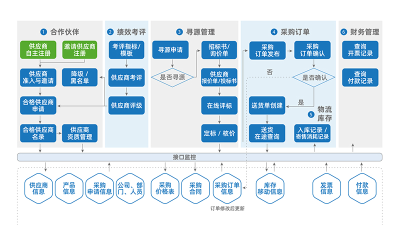 财务管理:供应商有关的开票记录、付款记录的同步与查询,若需要,可基于采购入库或寄售入库记录进行对账;