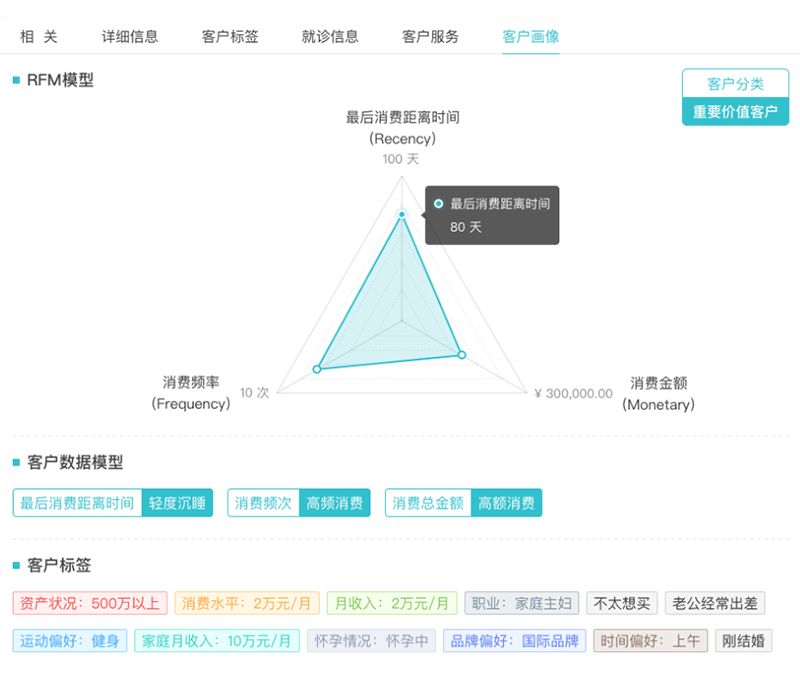 会员管理的基础性工作是认清用户。系统获取基本数据和行为数据后,医疗机构知道客户的年龄、职业、客户喜好,购物类型等,完成消费等级的划分;还可以标注有无过敏源,有无慢性病,形成完整的画像标签,为客户推荐更合适的产品和服务。同时为管理者提供战略支持,而这些战略满足用户需求后让用户产生二次消费兴趣,丰富用户体验,以此来保持稳定的用户生存周期。所以,民营医院打系统战的首要任务就是从系统层面把这些基础的信息搭建好,对客户信息的经营管理才能为接下来的突围做保障。