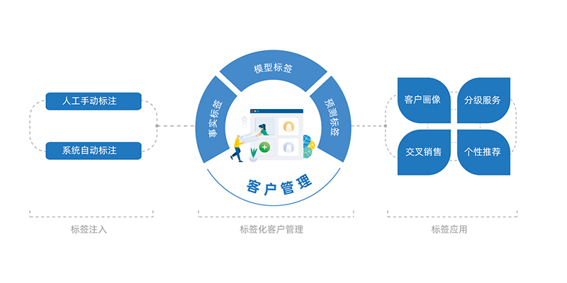 360度精准用户画像,通过手动标注事实标签,或配置客户数据模型由系统自动标注模型标签。对客户进行多类标签式信息记录,深度完善客户档案。精准、全面的输出客户画像,提高服务品质,促进销售成功率。