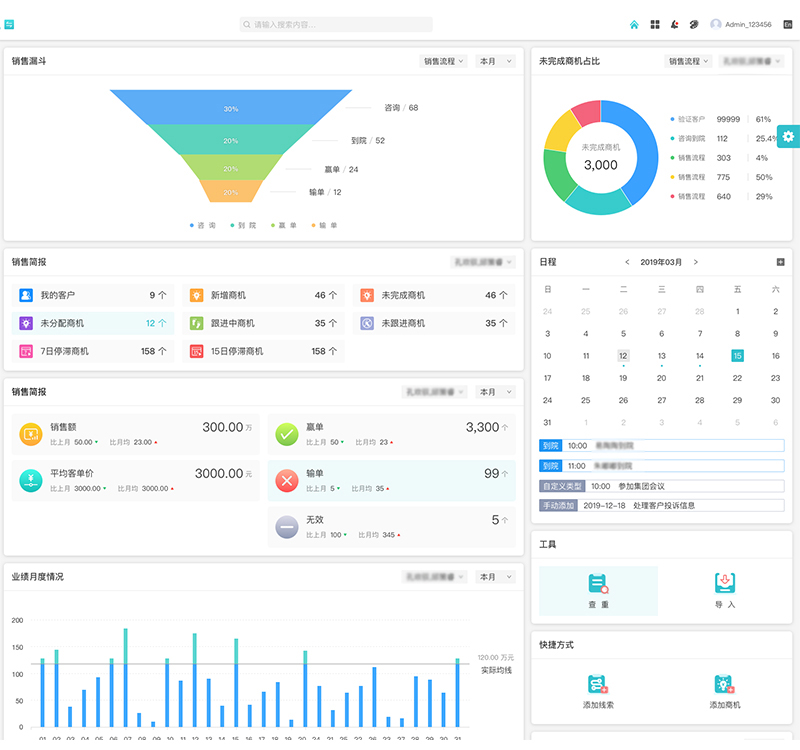 在销售维度上,支持从初次咨询到销售完成的全流程管理,可以对商机自定义多个销售阶段,记录商机跟进过程中的动态,生成销售漏斗,能够及时发现销售过程中出现的问题,保障销售目标的达成。同时系统还可实现自动化提醒,避免人工遗忘,对每一条销售线索都能精准监控。