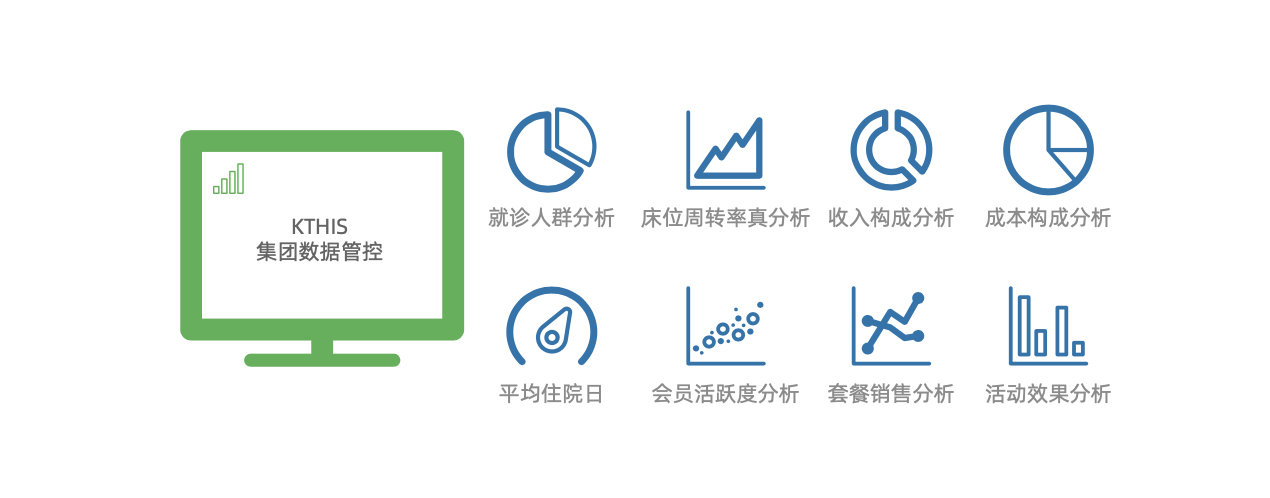 康博嘉HIS 提供全面业务数据分析功能,包括集团及单体医疗机构的门诊和住院实时运行数据、工作量数据、收入情况、用药情况、物资和药品库存周转情况、手术情况、会员销售情况、套餐销售情况、会员活跃程度及各类同比环比报表等。实时、准确的数据有利于各层级管理者掌握真实运营情况,并有针对性的进行管控。