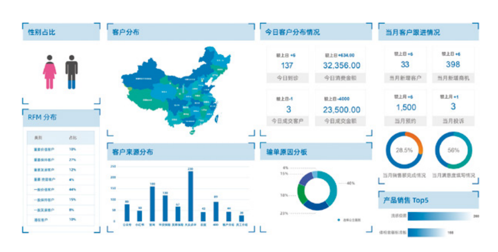 运用RFM模型对客户群体进行细分,通过可视化分析发掘数据价值,深度了解客群状态,区别高价值与低价值客户,将有限的资源合理地分配给不同价值的客户;以产品、营销、销售、服务等多维度统计数据,对各项业绩进行智能评级,实现效益最大化。