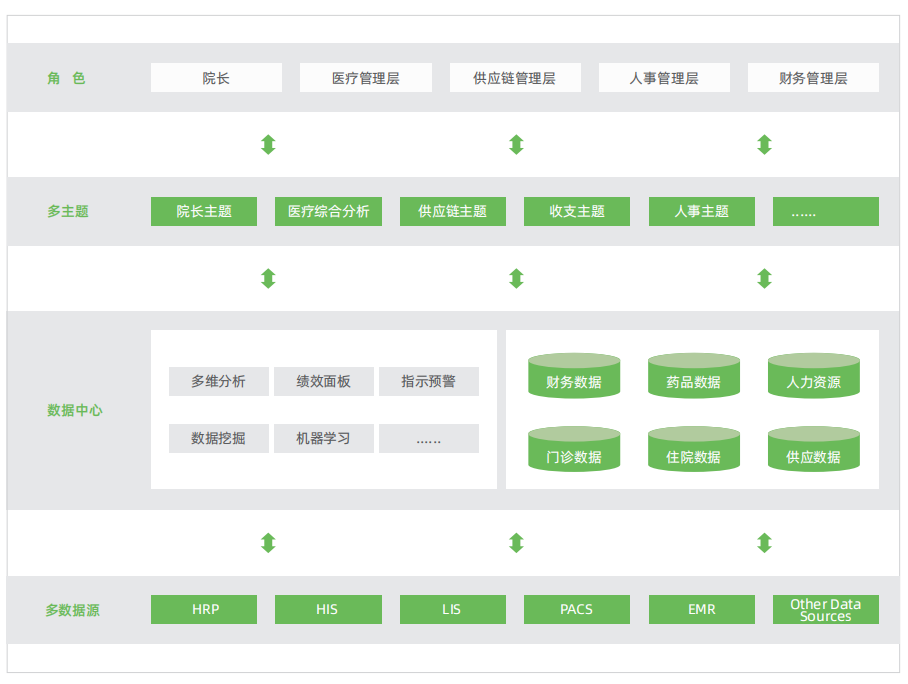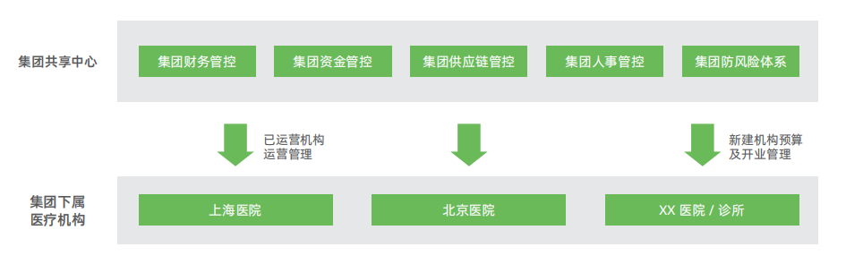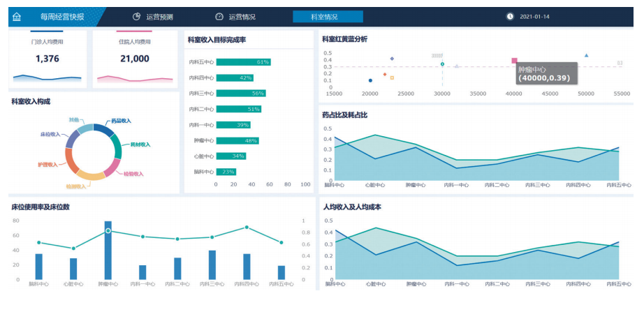 通过汇总集团下属各家医院的运营数据,全方位考察各子医院运营质量,全面业务数据管控分析,包括门诊和住院的实时运行数据、工作量数据、收入情况、用药情况、物资和药品库存周转情况、手术情况、供应商情况、人员绩效情况、会员销售情况、套餐销售情况、会员活跃程度及各类同比环比报表、预算情况等。实时、准确的数据有利于集团管理者掌握各地各级医疗机构的真实运营情况,并有针对性的进行管控。